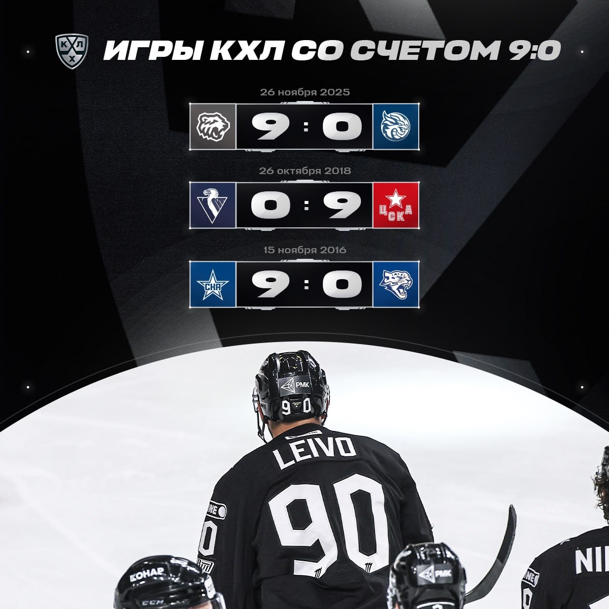 Впервые в истории КХЛ в игре, завершившейся со счетом 9:0, один из голов забил хоккеист, у которого на спине был написан итоговый счет матча