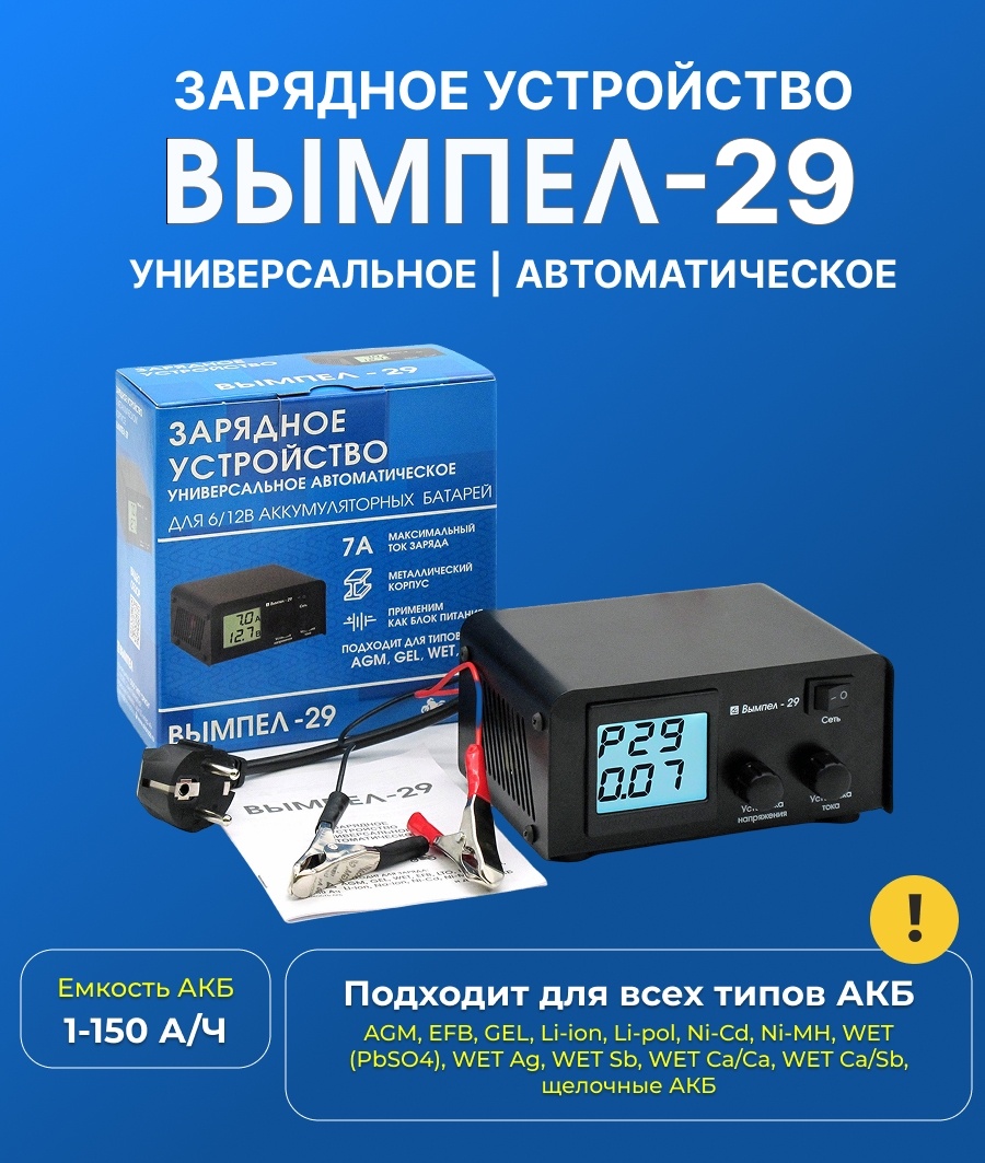 Теперь время рассказать об еще одной новинке - Вымпел 29. Это современное, надежное и удобное устройство предназначено для зарядки автомобильных и мотоциклетных аккумуляторов 6/12В, включая полностью разряженные до нуля. Вымпел 29 работает в полностью автоматическом режиме и при этом позволяет вручную регулировать силу зарядного тока в диапазоне от 0,8 до 7 А, а также плавно настраивать напряжение от 7,4 до 18 В. Этот универсальный зарядник подходит для разных типов аккумуляторов и емкостей, делает процесс зарядки удобным и безопасным, а также помогает продлить срок службы батарей. Если нужен надежный помощник для зарядки и обслуживания аккумуляторов — Вымпел 29 станет отличным выбором!