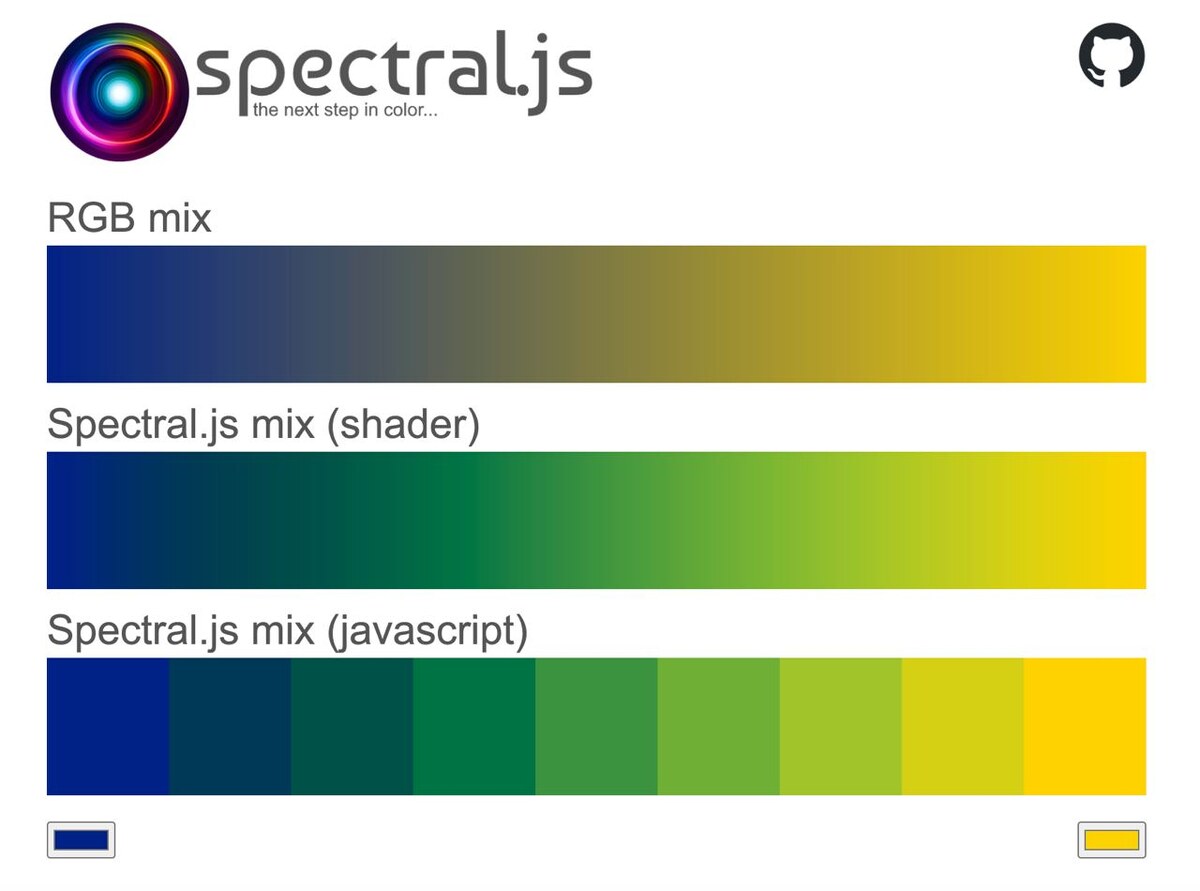 Spectral.js - это библиотека для смешивания красок, использующая теорию Кубелки-Мунка. Используя возможности теории Кубелки-Мунка, надежной научной модели, имитирующей взаимодействие света с краской, Spectral.js гарантирует, что ваши проекты будут иметь яркие и реалистичные цвета. Благодаря использованию 7 различных спектральных каналов, включая белый, голубой, пурпурный, желтый, красный, зеленый и синий, Spectral.js может быть эффективно использован в различных веб-проектах, таких как: Веб-дизайн: Насыщайте свои веб-дизайны реалистичными цветовыми палитрами благодаря способности Spectral.js к реалистичному смешиванию цветов. Графика: Повысьте качество графики, используя реалистичное смешивание цветов, которое точно отражает взаимодействие света с различными оттенками. Генеративное искусство: Создавайте захватывающее генеративное искусство, используя мощные возможности смешивания цветов Spectral.js, в результате чего получаются визуально ошеломляющие и динамичные творения. Воспользу