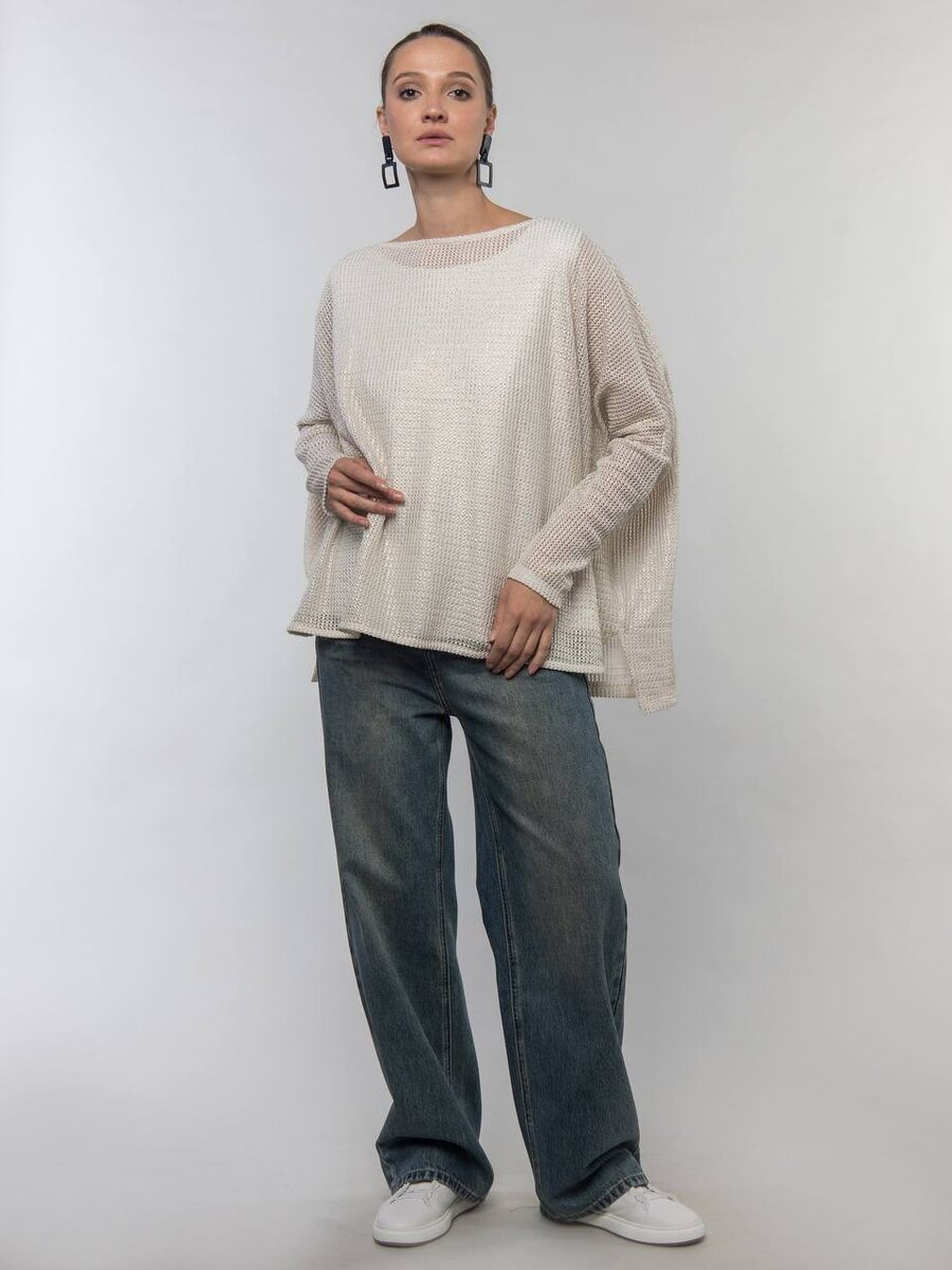 Изделие прямого расслабленного силуэта с длинным рукавом и круглой горловиной. Изысканный вид придает ажурная фактура полотна ткани с золотым напылением.