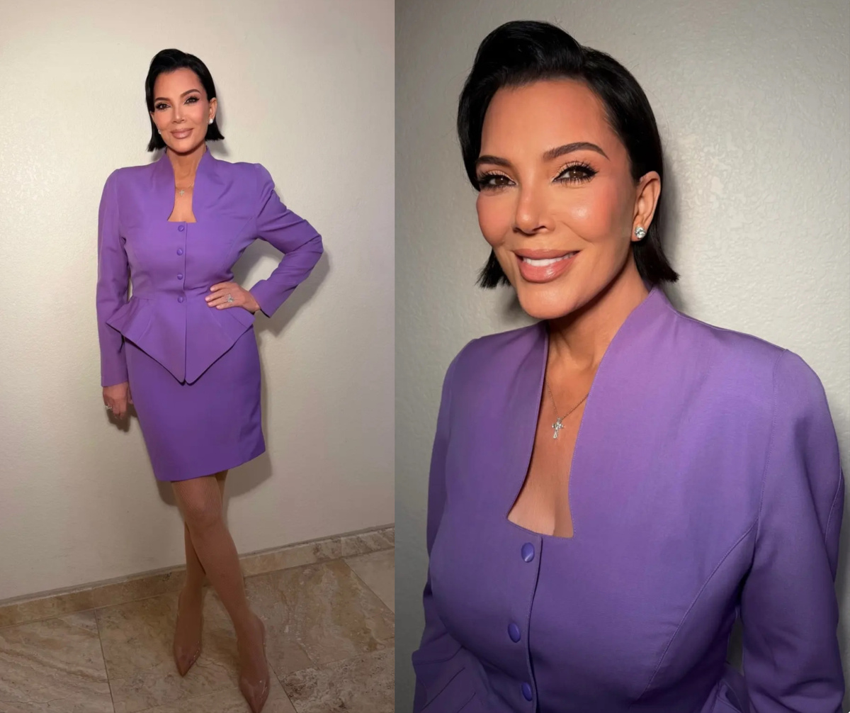 На этой неделе Крис Дженнер появилась в архивном фиолетовом костюме Thierry Mugler из коллекции «Осень–зима 1998» и мгновенно стала главной темой обсуждений в социальных сетях. Мини-юбка и архитектурный приталенный жакет с акцентными плечами вернули на повестку культовую эстетику power dressing конца девяностых, где власть, сексуальность и жесткая геометрия линий существуют в идеальном балансе. Силуэт выстроен по всем канонам эпохи. Укороченная линия юбки-карандаша, подчеркнутая талия, открытая зона декольте создают тот самый скульптурный объем, который когда-то сделал костюмы Mugler символом женской силы. Яркий фиолетовый оттенок усиливает эффект. В конце девяностых он звучал вызывающе, сегодня читается как спокойная, зрелая уверенность. Аксессуары Крис выбрала минималистичные. Телесные сетчатые колготки, нюдовые лодочки с острым мысом, бриллиантовые серьги и сияющий крест на тонкой цепочке создают эффект современного контекста, не споря с архивным характером костюма. Прическа также