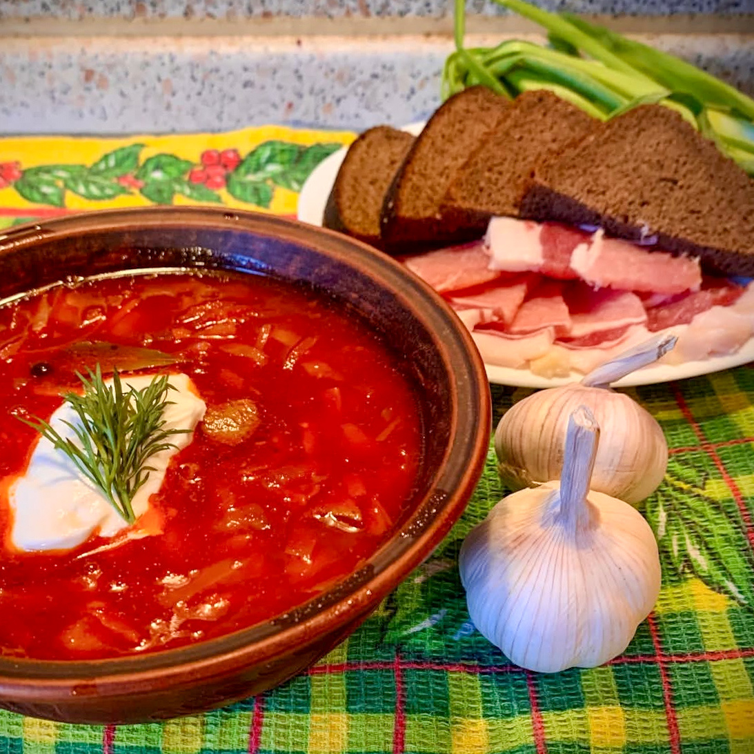 Сегодня в рубрике предлагаю вам приготовить короля супов-БОРЩ! Пока мужчина сажает дом и строит дерево, женщина рожает борщи и варит детей. Ой! Ну вы поняли! 😁 У каждой хозяйки свой рецепт, и мясо отличается, и состав блюда. Неизменной остаётся только свёкла. Ингредиенты: Говядина-у меня постная мякоть, но если бросить в воду говяжью косточку, то получится еще вкуснее! Свёкла-300гр Морковь-1шт Лук репчатый-1 большая луковица или пара мелких Растительное масло-для обжарки Уксус-1ч.л. Томатная паста-80гр Капуста белокочанная-2 средних листа Картофель-3шт Чеснок-3 зубчика Лавровый лист-3шт Перец горошком-4шт Сливочное масло-50гр Зелень Сок лимона, сахар, соль по вкусу Пробуем суп. Он должен быть и соленым, и сладким, и пряным, и с кислинкой одновременно. Если чувствуете, что какого-то оттенка вкуса не чувствуете, то добавьте соль/сахар/чёрный перец/сок лимона. Когда суп уже готов, добавляем сливочное масло и мелко нарубленный чеснок и начинаем разливать по тарелкам. Подаём со сметаной,
