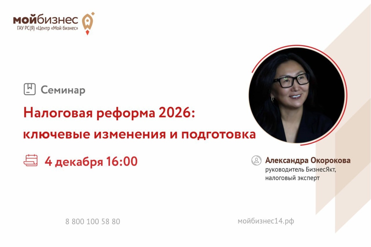 🚀Центр «Мой Бизнес» приглашает на бесплатный очный семинар для предпринимателей «Налоговая реформа 2026: ключевые изменения и подготовка» На мероприятии вы получите актуальную информацию о предстоящих налоговых изменениях, планируемых на 2026 год, а также рекомендации по подготовке бизнеса к новым условиям 📝Программа семинара: • Обзор основных налоговых изменений 2026 года • Как подготовиться к новым требованиям • Расчет оптимальной системы налогообложения и ставки НДС • Ответы на вопросы участников 🎙Спикер: Александра Окорокова — руководитель компании «БизнесЯкт», налоговый эксперт с 20+ лет опыта, практикующий предприниматель 📆Дата: 04 декабря 2025 года ⏰Время: 16:00 📬Место: г. Якутск, ул. Кирова, 18, блок Б, 1 этаж, Центр «Мой бизнес», конференц-зал ❗️Регистрация обязательна 🔗Для участия перейдите по ссылке: https://forms.yandex.ru/cloud/6927ec7890290281159700aa 🤝Развивайте бизнес с нами! @moibizsakha