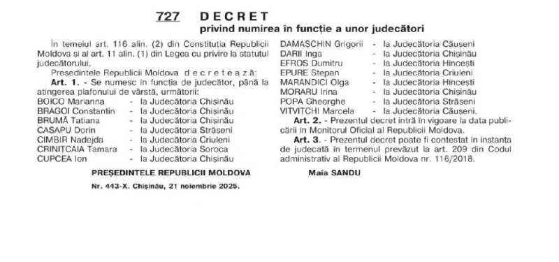 ⚡️🇲🇩А судьи кто? Указом президента назначены 15 новых судей Указом № 443-X глава государства утвердила назначение 15 судей на должность до достижения ими предельного возраста. Новые назначения касаются судов Кишинёва, Сорок, Криулень, Хынчешть, Стрэшень и Кэушень. ☝️😒Держим в курсе. @eNewsmd.online 👈 Подписывайтесь на наш канал