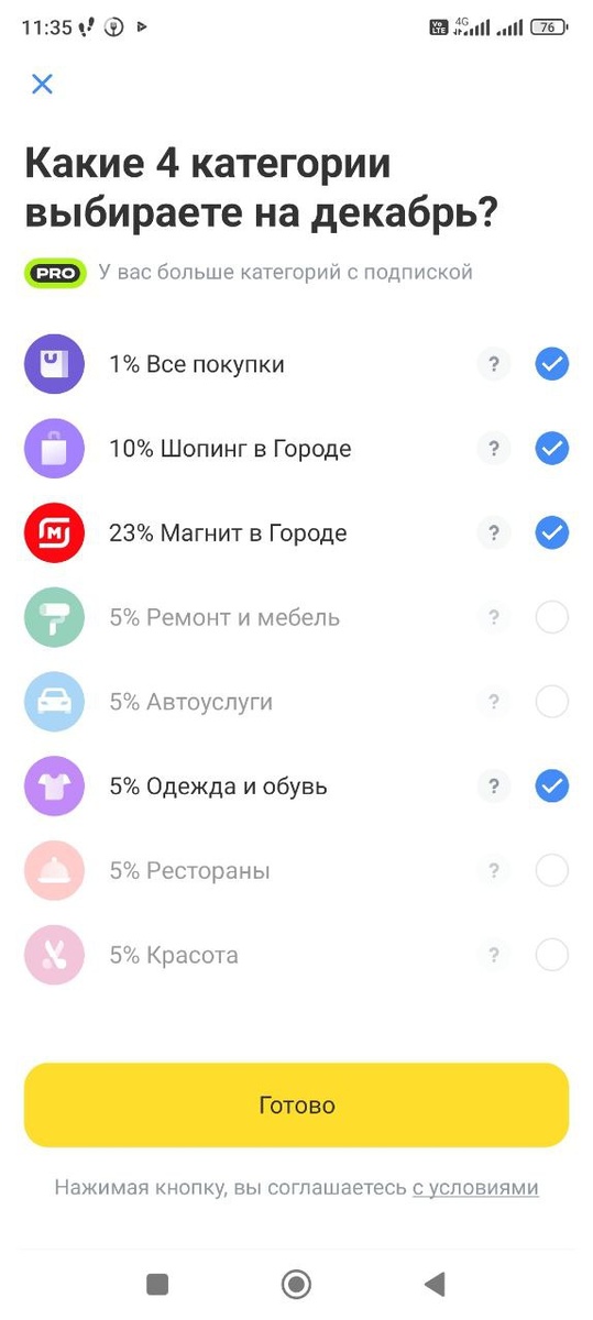 Кроме того, выбрала категории кэшбэка в