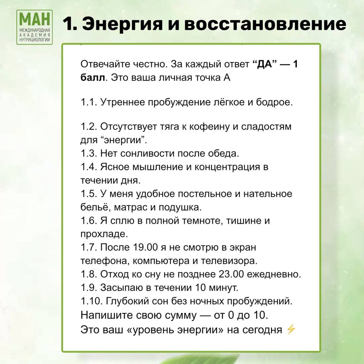 ☕️ Мини-челлендж: «Энергия без кофе» Сегодня мы начинаем самое главное — честную диагностику вашей энергии. Без неё невозможно понять, почему тело устает, когда вы “всё делаете правильно”. Отвечайте честно. За каждый ответ “ДА” на картинке — 1 балл. Это ваша личная точка А. Сегодня — маленький эксперимент, который покажет, откуда на самом деле приходит энергия. 🔥 Цель: Прожить завтрашний день без кофеина и сладостей, и посмотреть, как меняется концентрация, настроение и качество сна ✅В течение всего дня — никаких кофе и сладостей.А в 19:00 (плюс-минус 30 мин) — выключите все экраны, сядьте у окна или выйдите на улицу и просто наблюдайте за пейзажем 20 минут в тишине. Вечером отметьте: ✔️ Лёгкость в голове? ✔️ Приятная расслабленность? ✔️ Как быстро заснули? И важное напоминание: все результаты обязательно внесите в своё Колесо здоровья. Это поможет увидеть динамику и собрать честную картину вашей энергии. А уже 4 декабря мы разберём всё на онлайн-встрече. 🔥«Как собрать паз