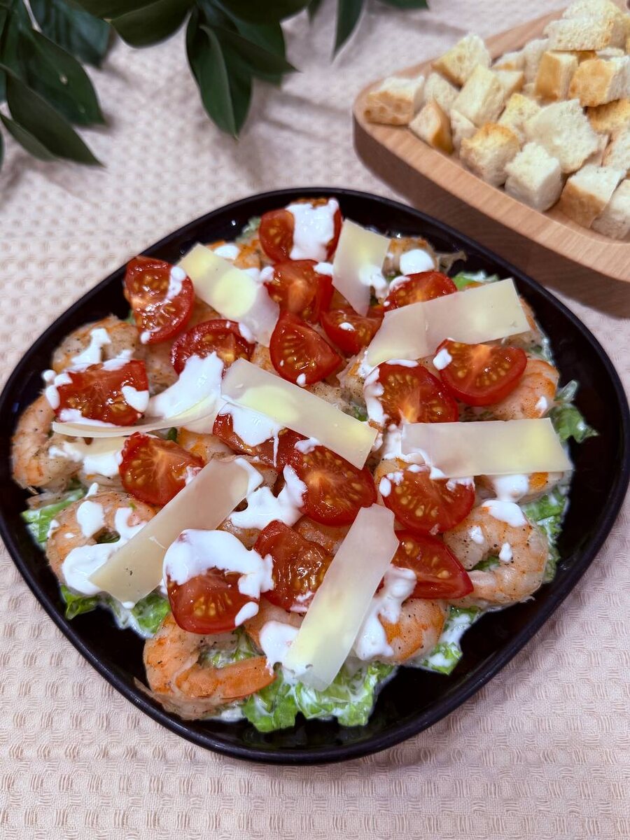 Вкусный салат с креветками🍤 и сухариками❤️ Основа: -свежий листовой салат (любой) -креветки очищенные -помидоры черри -сыр твердый (любой) -сухарики (у меня домашние) Для соуса: -сметана - 2 ст.л. -майонез - 2 ст.л. -горчица в зёрнах - 0,5 ч.л -чёрный перец (по вкусу) -кунжутное или оливковое масло - 1 ст.л. -сок лимона - 1 ст.л. Приготовление: Креветки очистите, добавьте чёрный молотый перец и измельчённый чеснок. Обжарьте по 2-3 минуты с каждой стороны. Соус - смешайте все ингредиенты до однородной массы. Собираем салат: Салат листовой порвите руками или порежьте на средние кусочки. Добавьте 3/4 соуса в порезанный салат и хорошо перемешайте. Каждый листочек должен пропитаться соусом. Выложите пропитанный соусом салат на тарелку. Сверху добавьте - креветки, помидоры черри и остатки соуса. Сыр с помощью овощечистки нарежьте тонкими ломтиками и украсьте салат. Получился вкусный салатик. И конечно, подавайте с сухариками. Домашние сухарики - батон нарежьте кубиками (по желанию