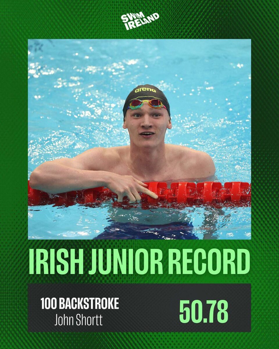 Похоже в Ирландии скоро забудут про Conor McGregor Новый национальный юниорский рекорд 100 на спине от John Short - 50.78, предыдущий принадлежал ему же (51.21) и был установлен в 2024 John установил новые юниорские рекорды на 50 вольным, 200 комплексом и 200 на спине (также абсолютный рекорд Ирландии)