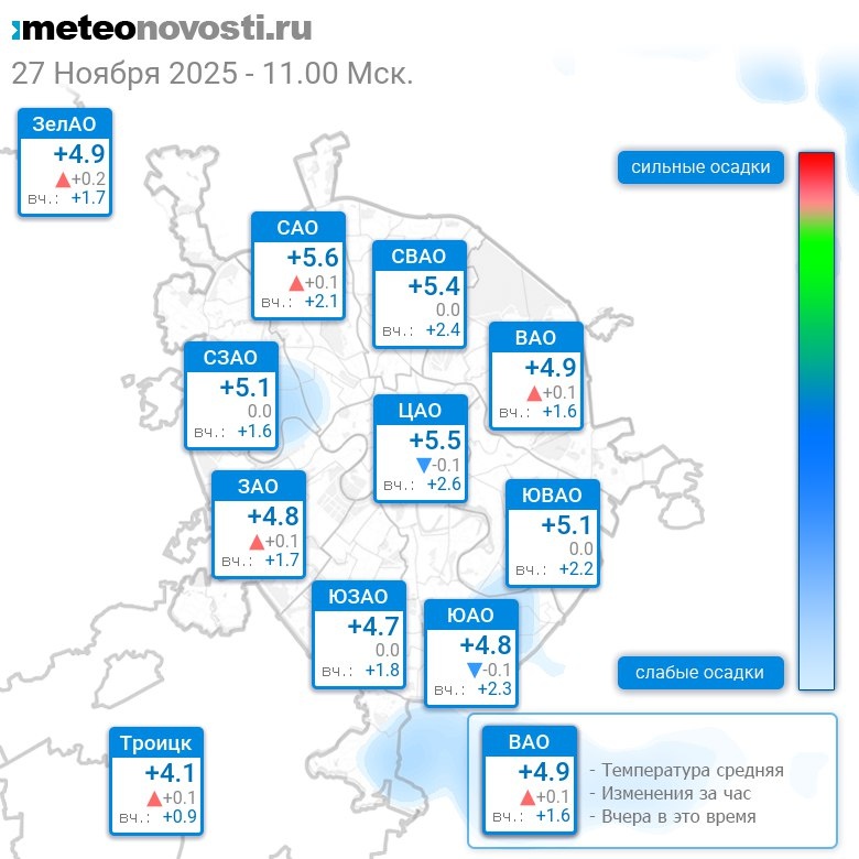 В 11:00 в Москве было от +3.9°C до +5.8°C, средняя температура +5.1°C #погода #Москва #осень #температура #27ноября #четверг