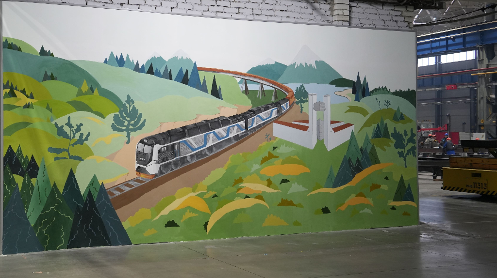 В тележечном цехе Брянского машиностроительного завода появилось яркое панно: студенты Брянского строительного колледжа изобразили тепловоз 3ТЭ328 в движении. Работа заняла более недели, а размер панно составляет почти 2,5 на 8 метров. Брянский машиностроительный завод стал одной из площадок регионального фестиваля «Артпром». В рамках события студенты Брянского строительного колледжа имени профессора Н.Е. Жуковского создали в одном из цехов яркое панно. Молодые художники изобразили на стене тележечного цеха БМЗ тепловоз 3ТЭ328 в движении. Грузовой локомотив с тянущимся составом превратился в оригинальное украшение производственного помещения. На создание граффити ушло более недели, а его размеры составляют почти 2,5 на 8 метров. Брянский машиностроительный завод регулярно участвует в городских и региональных проектах и поддерживает творческие инициативы на территории предприятия. В этом году завод также стал местом проведения студенческого пленэра, в ходе которого молодые художники ото