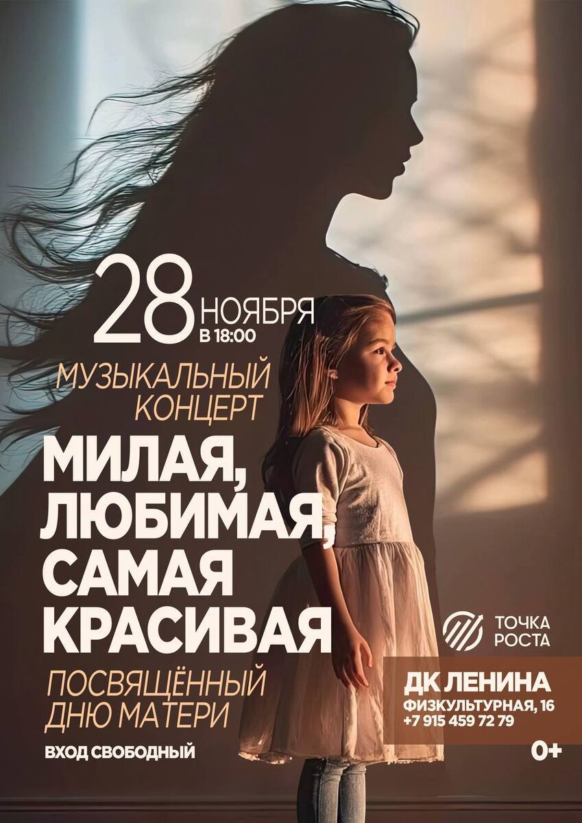 МИЛАЯ, ЛЮБИМАЯ, САМАЯ КРАСИВАЯ!🌸✨ 28 ноября в концертном зале Дворца культуры имени В.И. Ленина состоится музыкальный концерт, посвящённый Дню матери!💕 На сцене развернётся яркое и эмоциональное действо, наполненное любовью, теплом и искренностью в исполнении творческих коллективов Дворца культуры. Каждый номер – это подарок для наших дорогих мам и всех женщин!💖 🕖 Начало концерта в 18:00 📍 Адрес: ул. Физкультурная, д. 16 Вход свободный! Не упустите возможность подарить себе и своим близким вечер, полный музыки, нежности и положительных эмоций!🎶🌟 #дворецкультуры #дворецкультурыленина #дкленина #дк #дкногинка #дкимениленина #дворецкультурысерпухов #дксерпухов #деньматери