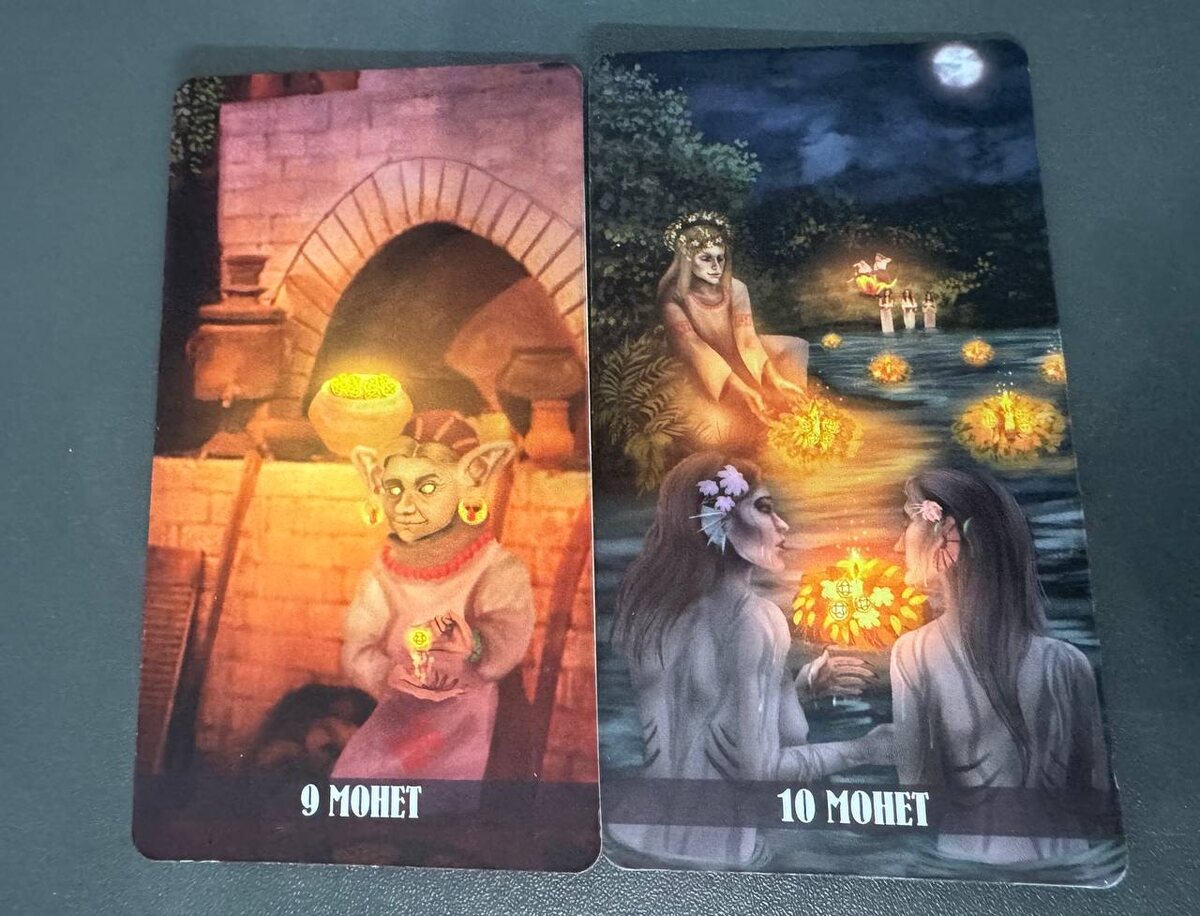 Эта серия — про сохранённый ресурс и про желания, которые выходят в пространство Нави. Про то, что человек хранит, и про то, что он отпускает. Про достаток, который стоит на силе, и про желание, за которым наблюдают те, кому видеть не стоит. Здесь Монеты показывают: что принадлежит тебе, а что — силам, которые рядом. Какие плоды ты можешь сохранить — и какие желания могут быть перехвачены. 💰🔥 9 Монет — Домовой достатка. Ресурс который только из печи Архетип