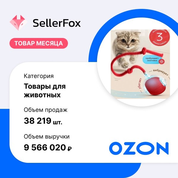 Котопёсы. Игрушка для кошек стала лидером по количеству продаж в категории "Товары для животных" на Ozon. За последние 30 дней товар приобрели более 38 тысяч раз на общую сумму около 10 млн рублей. Всего на Ozon за месяц приобрели свыше 15 млн товаров для кошек. Собаководы приобретали товары своим питомцам меньше - около 9 млн продаж. Более 1,7 млн товаров приобрели для лечения своих "братьев меньших".