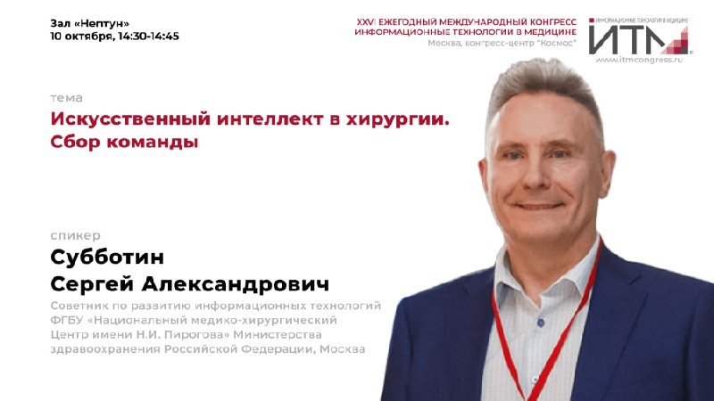 НМХЦ им. Пирогова намерен сформировать портфель проектов, направленных на внедрение цифровых технологий в хирургии. В каждом из них медико-хирургический центр нуждается в научных, академических, образовательных, технологических и клинических партнерах, сообщил на площадке "ИТМ 2025" советник по развитию информационных технологий ФГБУ "НМХЦ им. Н.И. Пирогова" Минздрава России Сергей Субботин. По его словам, хирургия серьезно отстает от других медицинских профилей в части использования возможностей искусственного интеллекта. Только совместными усилиями удастся наверстать упущенное. "В двух операционных медико-хихургического центра сейчас монтируются новые цифровые компоненты, что позволит развернуть большую современную систему хранения данных. Мы готовы делиться этим богатством с вами, чтобы совместно двигаться к развитию искусственного интеллекта в хирургии", – подчеркнул Сергей Субботин. В своем докладе он рассказал о нескольких возможных сценариях применения ИИ в хирургии: от форми
