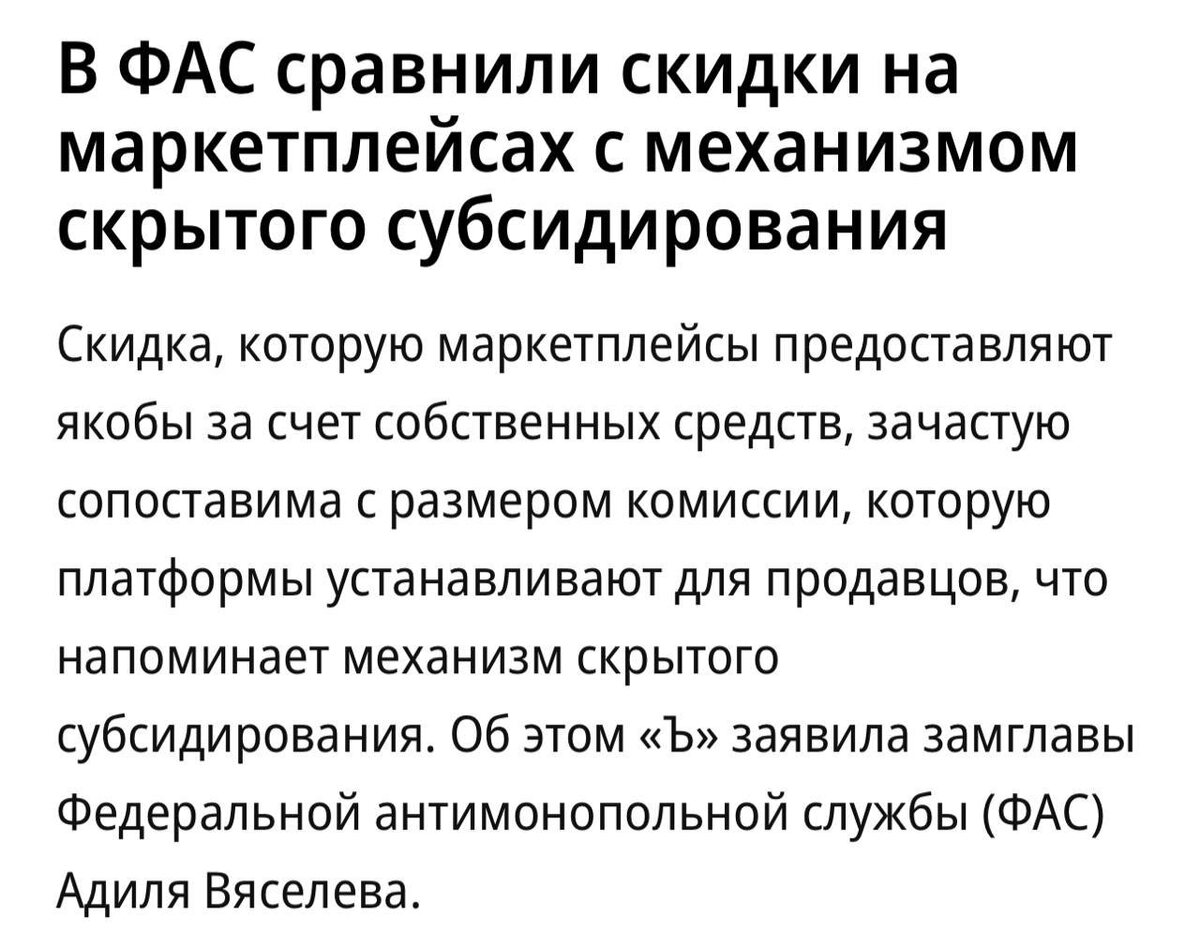 ✋ Что за заварушка? 🫢 ФАС включилась в разборки банков и маркетплейсов. Служба уже изучает предложение ЦБ запретить разную цену в зависимости от способа оплаты. «Мы понимаем желание бизнеса развиваться, в том числе в финансовом секторе, но для любых банков, которые хотят продвигать свои инструменты на аналогичных условиях, должен быть обеспечен равный доступ» Уточнили, что скидки внутри экосистем никто не запрещает, но на контроле будут любые программы, которые дискриминируют продавцов или вводят покупателей в заблуждение. Не понятно хуже нам от этого будет или лучше...