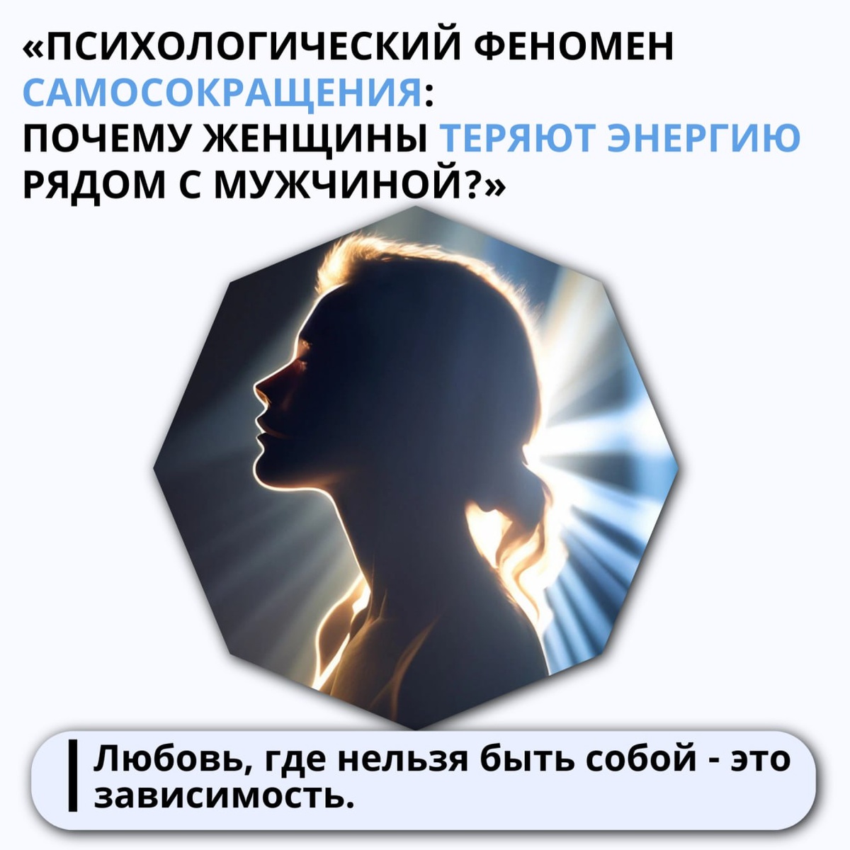 Психологический феномен самосокращения: почему женщины теряют энергию рядом с мужчиной? Последние недели мы говорим О СТРАХАХ - тех, что управляют нами незаметно, прячась за словами «мудрость», «женственность» и «баланс». Сегодня - о страхе, который проживают многие женщины: страх быть собой рядом с мужчиной. В начале отношений женщина полна энергии, идей, вдохновения. Но со временем появляется вялость, усталость, будто кто-то внутренне «приглушил свет». Женщина, которая раньше действовала уверенно, вдруг начинает уменьшать себя - мягче говорит, меньше хочет, уступает чаще, чем нужно. ❗️Это не про деньги и не про амбиции. Это про психику, которая выбирает безопасность вместо самореализации. Неосознанно женщина подстраивается под партнёра, чтобы сохранить близость: «Если я стану сильной - он почувствует себя хуже». «Если я вырасту - он уйдёт». Так включается механизм самосокращения - стратегия, в которой любовь удерживается за счёт потери себя. 🖋Психотерапевт Хэрриет Лернер в книг