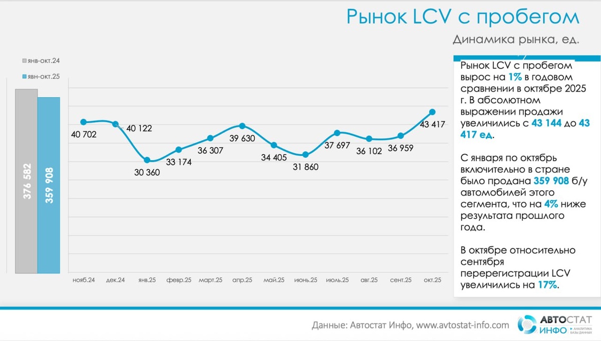 Рынок подержанных LCV удержался почти на уровне 2024 года По данным «Автостат Инфо», рынок подержанных легких коммерческих автомобилей в России к октябрю 2025 года показал относительную устойчивость. За 10 месяцев было перепродано 359 908 ед. LCV против 376 582 шт. годом ранее, то есть объем рынка снизился всего на 4% год к году. При этом октябрь сам по себе вышел с сильным результатом: перерегистраций стало 43 417 ед. против 43 144 ед. в октябре 2024 года, то есть рост на 1%. К сентябрю 2025 года, когда было оформлено 36 959 повторных сделок, рынок LCV с пробегом прибавил сразу 17%. Фактически вторичный сегмент LCV уже большую часть года отыгрывает провал начала 2025-го и выходит на траекторию плавного восстановления. По брендам видно, что основу рынка по-прежнему держат традиционные игроки, но влияние иномарок постепенно растет. В октябре лидерство сохранил ГАЗ: 17 546 проданных машин с пробегом против 18 199 годом ранее, минус 4% при сохранении первой позиции. За январь–октябрь про