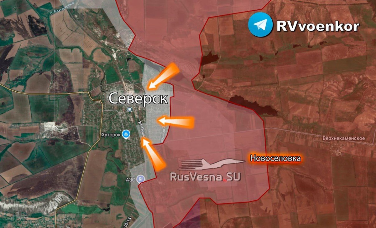 Новости одной строкой: — Армия России штурмует центр Северска, прорвав самый мощный укрепрайон ВСУ на Донбассе Недавно стало известно, что российские войска прорвали самую мощную и долго удерживаемую линию фронта ВСУ на Донбассе. ВС РФ сначала вошли в Северск с юга, затем заняли восток, юго-восток и северо-восток, продвинувшись к центру ключевого города для обороны противника. Сейчас наши войска штурмуют центр города, продвигаясь вперёд. Площадь продвижения за несколько дней: около 10 км². — Северское направление. На северном участке в Ямполе зачищаем и уничтожаем противника. В р-не н.п.Северск зачищена сеть опорников и мы развиваем наступление с северо-восточной стороны города, заняли позиции в частном секторе и начали бои в центре Северска в р-не ж/д вокзала. На южном участке наносим удары артиллерией, авиабомбами и беспилотниками по путям снабжения ВСУ. — ⚡️Мирноград. Боевики всу оставили еще три опорника. Украинские ЗМИ нервно сообщают, что до полного окружения в Мирнограде остало