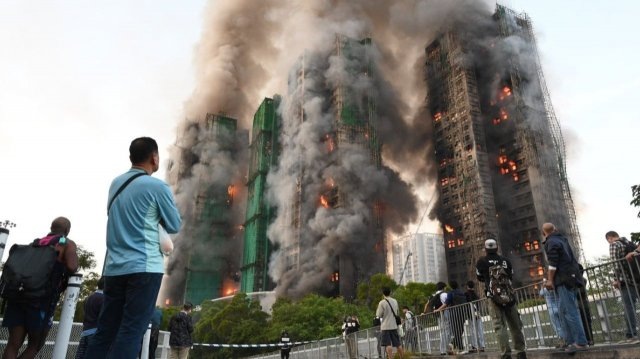 Первый фактор — бамбуковые леса и защитная сетка вдоль фасадов. Сами по себе леса не редкость для Гонконга, но при плотной застройке и сильном ветре они превращаются в удобный «канал» для огня. Наличие горючей сетки и плёнки усилило эффект: загоревшиеся фрагменты легко отделялись и падали вниз или переносились ветром.