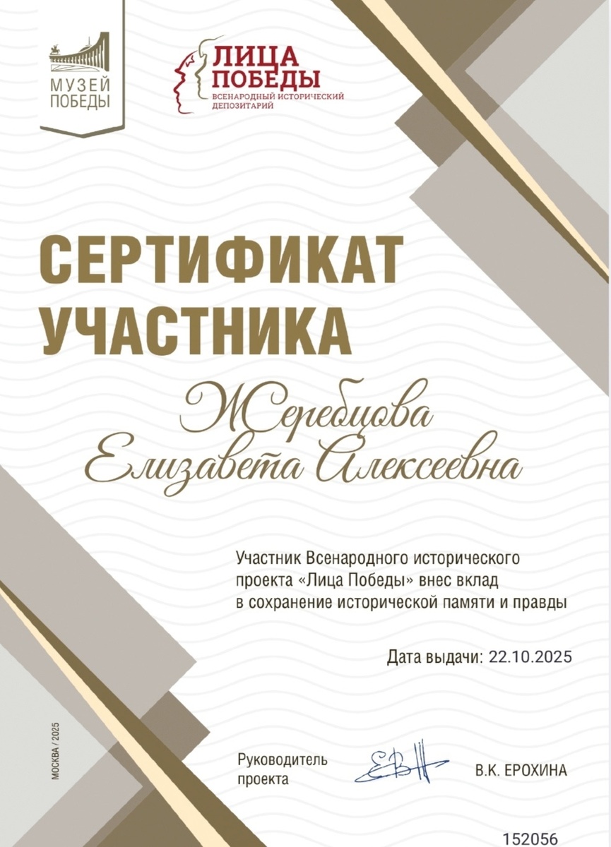 Ученица 10 класса и активистка Движения Первых Жеребцова Елизавета стала участницей Всероссийского проекта «Трудовая доблесть. Лица Победы» В рамках данного проекта Елизавета внесла в архив Всенародного исторического депозитария «Лица Победы» информацию о своем прадедушке Кулешове Михаиле Игнатьевиче. Его судьба была связана с историей нашей страны, он её мужественно защищал и на фронте, и в тылу, выполняя ответственную работу, внес свой вклад в достижение великой Победы! Проект реализуется Движением Первых совместно с Музеем Победы и Поисковым движением России.