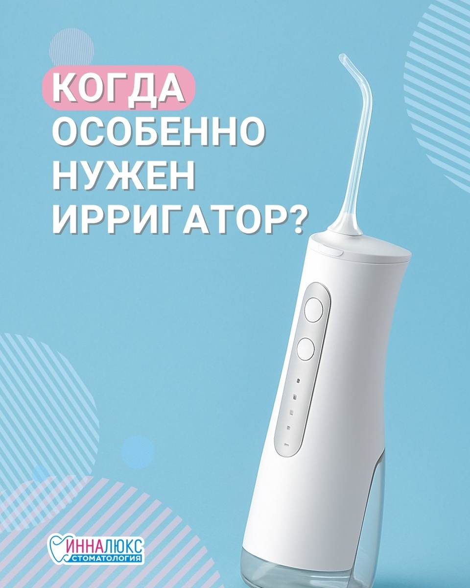🦷 Ирригатор — это не просто гаджет, а настоящий помощник для вашей улыбки. 👇 Когда он особенно нужен и даже рекомендован стоматологами? 🔹 При проблемах с дёснами (кровоточивость, пародонтит). Мягкая струя воды: • улучшает кровообращение; • уменьшает отёк; • разрушает бактериальную плёнку у края десны — главную причину неприятностей. 🔹 Если есть коронки, мосты или импланты. Ирригатор вымывает остатки пищи из труднодоступных мест и помогает снизить риск воспалений. 🔹Тем, кто носит брекеты. Щётка не всегда дотягивается до всех участков вокруг замочков, а ирригатор очищает идеально — меньше налёта, меньше риска появления кариеса. ❗ Важно помнить, что ирригатор — отличное дополнение к щётке, нити и ёршикам, но не замена! 📲 Запись на приём по телефону +7 (4912) 20-00-05. ✅ ВКонтакте vk.me/innaluxe ✅ WhatsApp +7-900-6-20-00-05