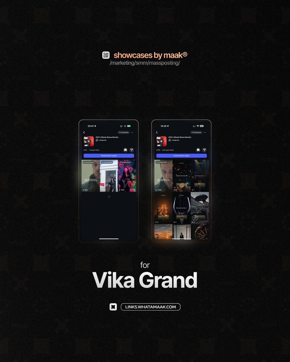➕ #case — Массовый постинг в Instagram* ❤️ Для кого? Vika Grand 🔼 Что было сделано? • Размещение edit-видео и видео-нарезок с треком артиста; • Массовый постинг 🛒 Заказать 🔍 Другие услуги ℹ️ #массовыйпостинг #instagram — * продукт компании Meta, которая признана экстремистской организацией в РФ. 🔗 maak® × подробнее