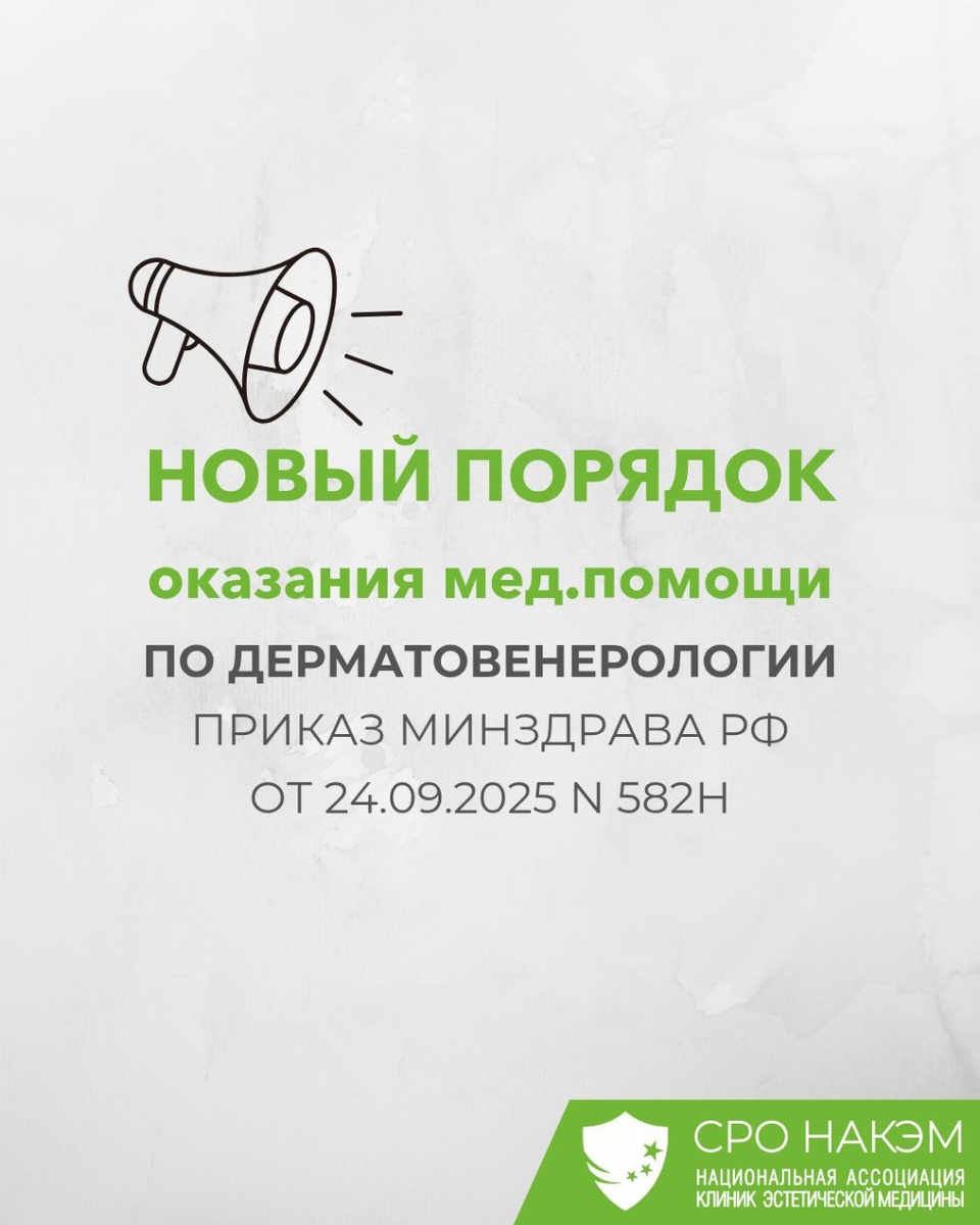 🚩 Внимание! Просим Вас обращать внимание на дату выхода публикации, в связи с изменениями в законодательстве представленный материал может утратить актуальность частично или полностью в более поздние даты. 27.10.2025 Минюст России зарегистрировал Приказ Министерства здравоохранения Российской Федерации от 24.09.2025 № 582н с актуализированным Порядком оказания медицинской помощи населению по профилю «дерматовенерология». В результате принятия документа утратил силу приказ Минздрава № 924н от 15 ноября 2012 года «Об утверждении Порядка оказания медицинской помощи населению по профилю «дерматовенерология». Среди нововведений – правила организации деятельности кабинета врача-дерматовенеролога, дерматовенерологического дневного стационара и возможность использования технологий телемедицины. Теперь медпомощь по профилю необходимо оказывать с использованием клинических рекомендаций и стандартов медицинской помощи, а медики для дистанционного взаимодействия между собой и пациентами будут пр