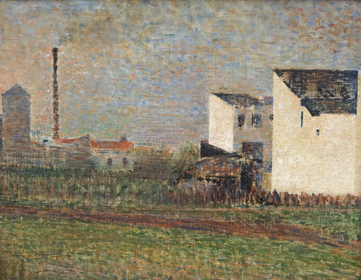 Написанная примерно в 1882 году, картина «Промышленный пригород» раскрывает интерес Жоржа Сёра (1859-1891) к жизни рабочего класса и зачастую нищенским условиям их жизни. Художник любил зарисовывать промышленные пригороды Парижа и огромные фабрики современного мира. Однако в своих работах он никогда не выражает своего личного мнения о сюжете, всегда сохраняя объективную точку зрения, избегая сильных эмоций или эмоциональных комментариев. Вместо этого Сёра стремился достоверно запечатлеть тот самый момент. Эта беспристрастная объективность – отличительная черта его мастерства в изображении окружающего мира. На данном полотне Сёра изобразил промышленный пригород, в котором доминируют внушительные, неприглядные здания, над которыми возвышается единственная фабричная труба слева. Прозрачная дымка, поднимающаяся из трубы, подчёркивает индустриальную жизнь, разворачивающуюся внизу, скрытую за зданиями. Композиция построена из множества вертикалей, создающих впечатление рукотворного пром