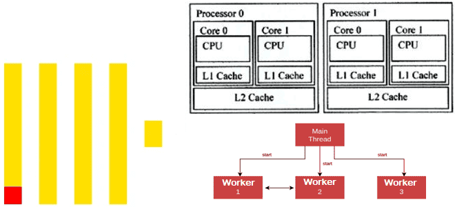 Пока рабочие потоки выполняют CPU-интенсивные операции, главный поток может заниматься операциями ввода-вывода. Эта модель хорошо масштабируется от однопроцессорных систем до многоядерных серверов. Взаимодействие между потоками можно представить так: