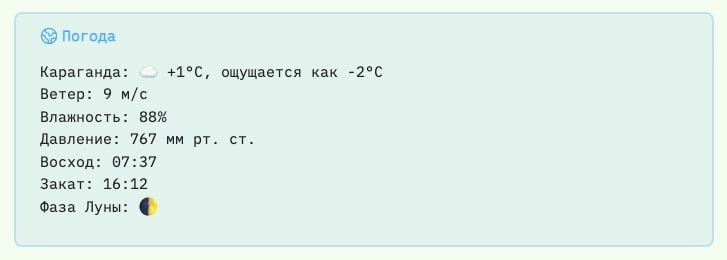 ☀️ Автоматически получаем погодную сводку: Templater + Open Meteo В "большом" чате пару раз проскользнули упоминания (и решения) по автоматическому добавлению погоды в заметки, например в ежедневные. У меня предложенные решения не сработали (или сработали криво), поэтому чуть допилил скрипты и делюсь результатом. На обложке - то, как выглядит блок с погодой сразу после создания ежедневной записи, все делается автоматически после первичной настройки. ⚒️Как сделать: 0. Ставим Templater, если он еще не установлен. 1. Берем скрипт getWeather.js из первого комментария и кладем его в папку с вашими скриптами Templater (укажите ее в настройках Templater в разделе Script Files folder location. У меня в скрипте следующий блок (для моего местоположения, вам надо заменить на свои данные: // ----- запрос к Open-Meteo ----- const lat = 49.806; // Караганда const lon = 73.086; 2. В шаблон ежедневной заметки в то место, где вы хотите чтобы вставлялся блок с погодой, добавляем строчку <%* tR +=
