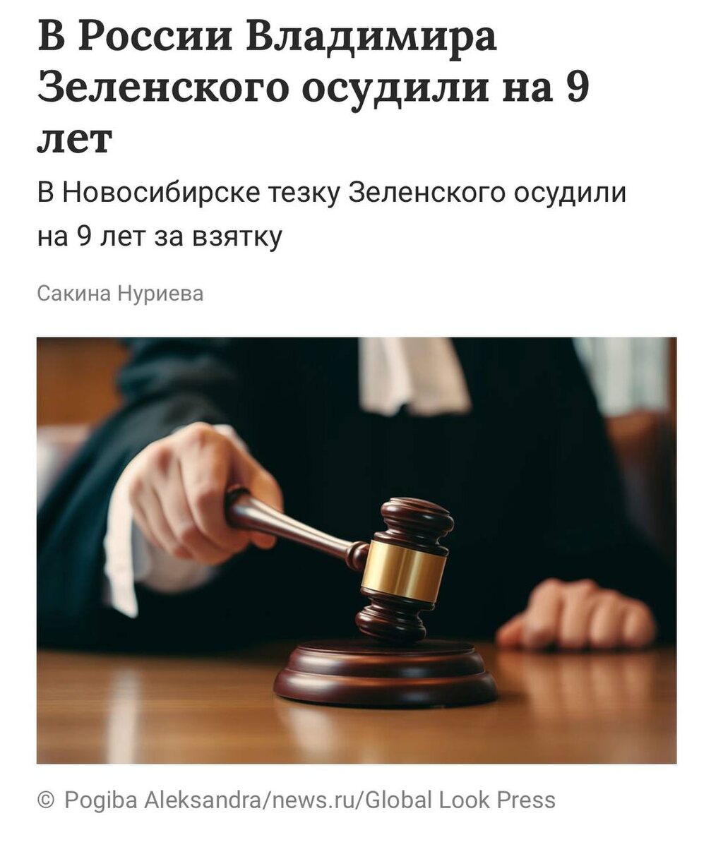 Владимира Зеленского осудили в России на 9 лет. За взятку. Тёзку сами знаете кого приговорили к лишению свободы и штрафу в размере 1,5 миллиона рублей Согласно материалам суда, новосибирский Зеленский потребовал заплатить за разрешение демонтировать здание в вверенном ему в охрану военном городке. Часть суммы — 500 тысяч — передали сразу, ещё миллион должны были занести потом. Задержали Зеленского во время передачи денег.