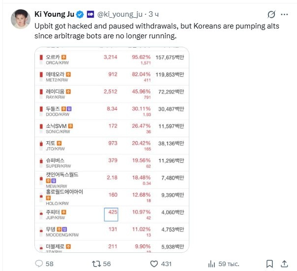 Upbit была взломана и приостановила вывод средств, но корейцы продолжают накачивать альткоины, поскольку арбитражные боты больше не работают.