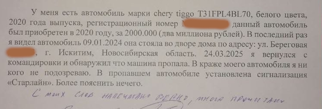 «В ходе рассмотрения жалобы установлено, что 09.04.2025 в КУСП МО МВД России «Искитимский» за номером 5839 зарегистрировано заявление Баранова С.В. о пропаже автомобиля «Chery Tiggo 8».