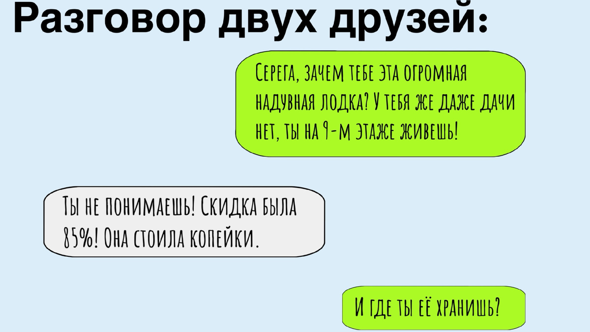 Это классика жанра. Черная пятница пробуждает в нас инстинкты выживальщика, готовящегося к зомби-апокалипсису. Мы скупаем вещи не по принципу «мне это нужно сейчас», а по принципу «вдруг когда-нибудь пригодится, а оно уже есть». У каждого дома есть такой «шкаф позора» или «полка надежды». Там лежат: йогуртница (использовалась один раз в 2018 году), набор для фондю (ни разу не открывали), лыжные ботинки (хотя никто не катается) и тот самый третий тостер. Мы смотрим на эти вещи и думаем: «Какой я хозяйственный!». А вещи смотрят на нас и думают: «Зачем ты нас купил, безумец?». Но лодка в гостиной — это, конечно, новый уровень дзена. Хотя бы пыль под ней протирать не надо.