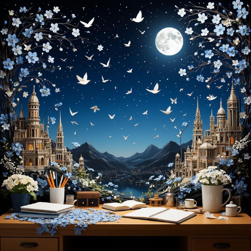 🌛 Сказочная ночь micro forget-me-nots pattern art, 3d flying objects on the desk, fluid miniature city, murmuration, birds and lights, national geographic style, night+moon Что думаете? 🔥 — Круто! 😨 — Ну такое... #AI Делитесь своими промтами в комментариях🙉 Подписаться. Midjourney, SORA & DALL: IT, Нейросети