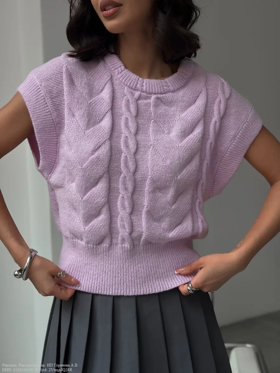 Первый предмет в этой подборке — мягкая лиловая жилетка, которая чувствуется как тёплый плед, но выглядит гораздо аккуратнее. У неё удобная укороченная форма, которая подчёркивает талию, но не создаёт лишнего объёма. Фактурная вязка с косами добавляет выразительности — выглядит так, будто вещь связана вручную, с любовью.