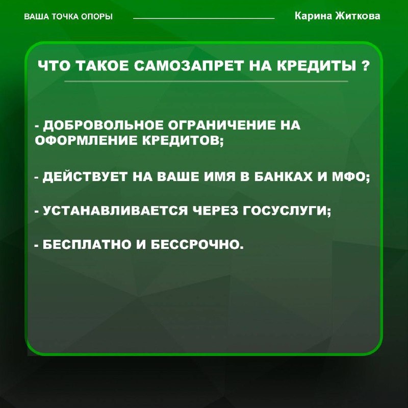 ‼️С 1 марта 2025 года в России работает сервис самозапрета на выдачу кредитов — мощный инструмент финансовой безопасности. Разберёмся, как он работает и как его установить. Что это такое? Самозапрет — это добровольное ограничение, которое вы устанавливаете на своё имя. После его оформления: вы сами не сможете взять кредит; мошенники не смогут оформить заём на ваше имя. На какие кредиты не распространяется? ипотека; автокредиты с залогом автомобиля; образовательные кредиты с господдержкой. Пошагово как оформить - описали в карточке к этому посту👆🏻 Важно: запрет вступает в силу на следующий день после уведомления от БКИ; действует бессрочно; устанавливается бесплатно. Отзывы тех кто уже освободился от долгов и живет свободно. ⚡️ Запишитесь на бесплатную консультацию и узнайте больше о процедуре и на сколько она подходит именно вам. 🎁Шаблоны документов по защите от кредиторов и коллекторов. 🎁Розыгрыш бесплатного банкротства