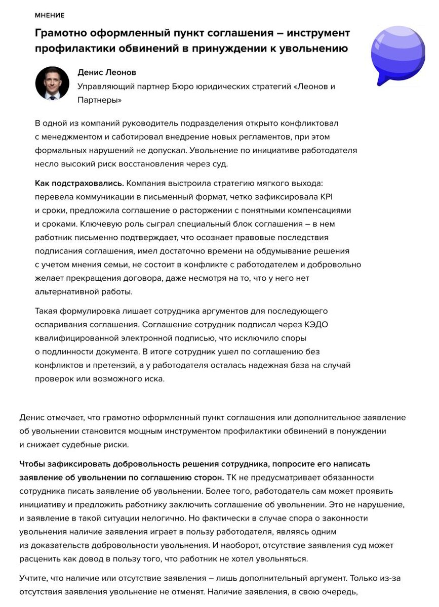 В ноябре в Актион360 вышел мой комментарий о том, как один грамотно оформленный пункт соглашения помогает работодателю обезопаситься от обвинений в принуждении к увольнению. Разбираю реальный кейс: конфликтный руководитель, риск восстановления через суд и стратегия «мягкого выхода» через соглашение сторон. А завтра здесь, на канале, выйдет продолжение – разберём тему «Как закрепить добровольность в соглашении о расторжении трудового договора» и переведём идеи из комментария в понятные формулировки, которые можно использовать в документах работодателя.