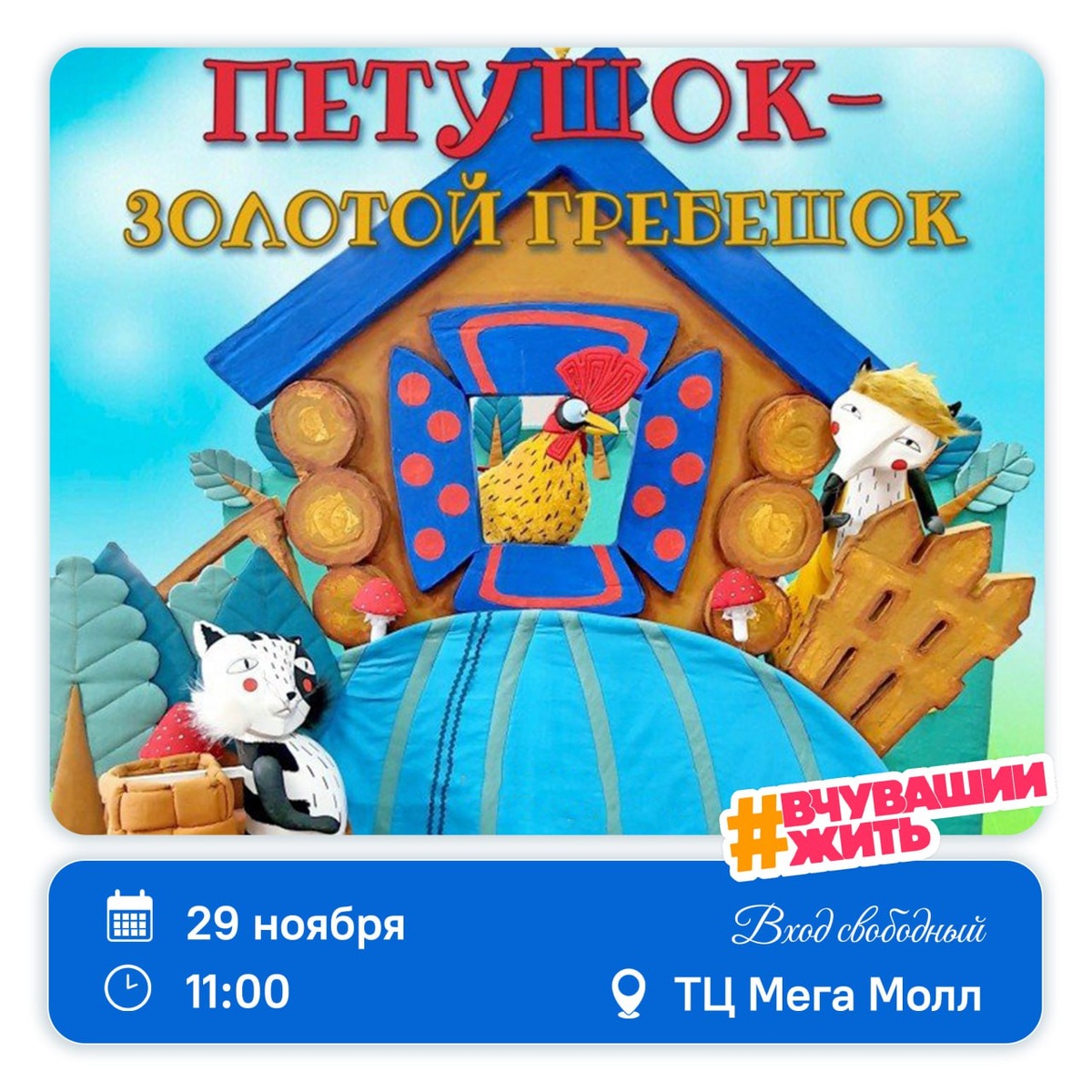 #вчувашиижить – выходные ярко проводить Суббота – время для эмоций. И мы знаем, где их найти. 🎭 В эти выходные идём в ТЦ «Мега Молл» не за покупками, а за настоящей сказкой. Для вас и ваших детей – бесплатный спектакль «Петушок – Золотой Гребешок» от артистов Чувашского государственного театра кукол😉 🗓 29 ноября, 11.00 📍ТЦ Мега Молл, 5 этаж Подписаться / Предложить новость