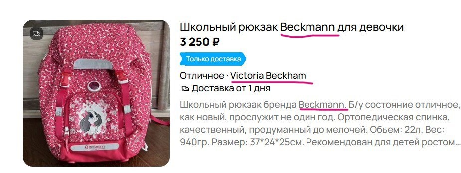 Как делать не нужно. Девушка не долго думая, подставила созвучный бренд в окошко при заполнении объявления. (или просто пропустила подсказку ИИ) И в итоге, объявление выдает поиск по Victoria Beckham А этот детский рюкзак там неуместен. Целевых просмотров нет, отказы есть. Алгоритмы запихивают объявление все ниже и ниже при обычном поиске по названию товара. Лучше написать "другой" в окошке "бренд" Больше пользы для объявления.