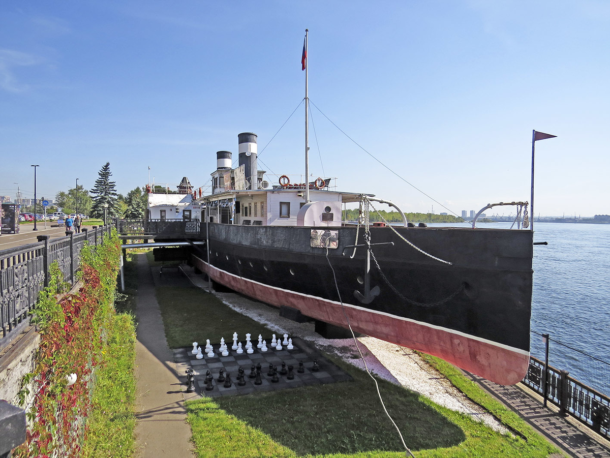 "Святитель Николай", лежащий на набережной в Красноярске - ни много ни мало, старейшее судно в России! Его построили в 1886 году по заказу крупнейшего иркутского купца Александра Сибирякова в Тюмени, на Жабынском судозаводе старовера Ивана Игнатова, и в следующую навигацию он принял на борт первых пассажиров. Тогда это было самое крупное, мощное и комфортабельное судно Енисея 58 метров длиной, 8,5 метров шириной и 125 сантиметров осадкой. Да вдобавок с туерной лебёдкой, насквозь проходившей вдоль корпуса - закрепив начало и конец троса, "Св. Николай" мог пройти любой порог без посторонней помощи. Прославили это судно его пассажиры. 1 июля 1891 по пути из Азиатского вояжа на своём железном тёзке пересекал Енисей цесаревич Николай, будущий последний император. 30 апреля 1897 года же услугами "Святителя Николая" воспользовался Владимир Ульянов, в шушенскую ссылку ехавший за свой счёт со всем комфортом. Именем Ленина списанный в 1960 году "Святитель Николай" и был сохранён, а в 1970 году с