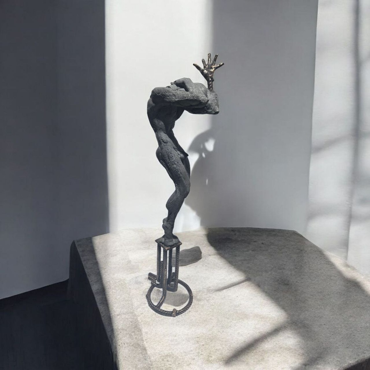 Скульптура Семёна Жохова "Антлант" – воплощение его виртуозного мастерства, в котором гармонично сочетаются дух академической школы и смелость современности. Это часть значительного авторского цикла, посвященного исследованию внутренней борьбы и волнующего процесса перерождения. Выполненная из шероховатого бетона и лучезарной бронзы, эта работа является проникновенным воплощением напряжённого перехода, когда внутренние конфликты становятся мощным катализатором судьбоносных изменений. Изогнутая поза и напряженные линии фигуры, выверенные с феноменальной точностью, отражают состояние зыбкой неустойчивости и хрупкости, характерное для момента преображения. Аскетичная фактура бетона подчеркивает гнетущее бремя земного существования, а сияние бронзовой кисти руки, устремленной к недостижимым небесам, вносит желанную ноту надежды и возрождения, символизируя обретение новой, окрыляющей формы и смысла через преодоление. В этой пронзительной работе, как и во всем творчестве Семёна Жохова, тело