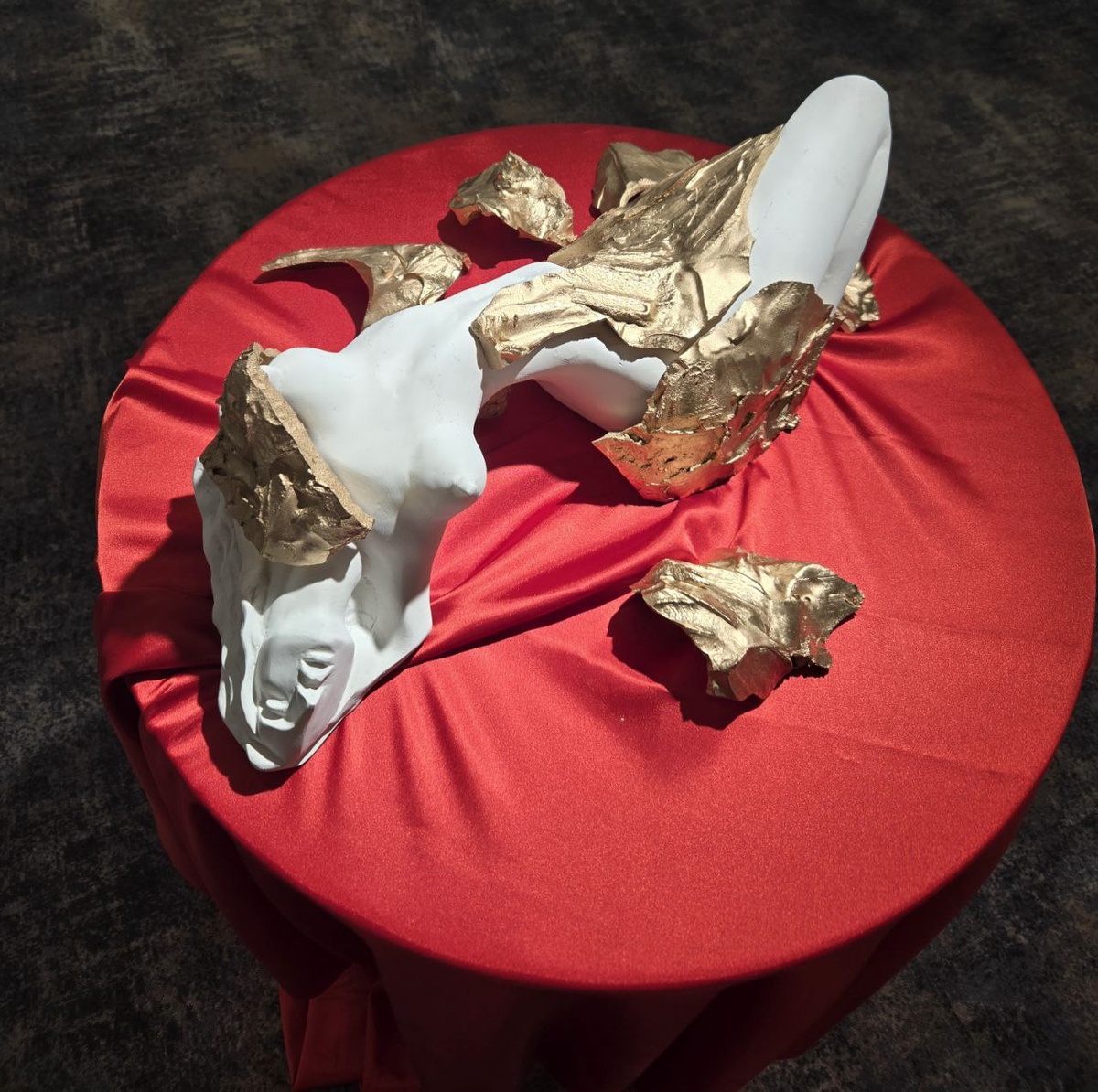 Перед нами не просто скульптура, а откровение творческого процесса, запечатленный момент алхимической трансформации. "Джульетта" Анны Сосенской – это не застывший образ, а живой, дышащий "исходник", первая, зыбкая форма, из которой рождается будущий шедевр. Белое ядро скульптуры скрыто под золотистыми осколками – следами былой глиняной оболочки, своего рода "кожей", которую сбрасывает с себя творение в процессе своего становления. Эти фрагменты – не просто остатки работы, а свидетельства борьбы формы за самоопределение, материальные символы уходящего и нарождающегося. Название "Джульетта" обогащает эту концепцию, перенося фокус с абстрактной трансформации на рождение конкретного образа, наполненного историей и эмоциями. Эта "Джульетта" находится в состоянии перманентной генерации, освобождаясь от грубых, необработанных форм, чтобы высвободить внутреннюю суть, потенциал возвышенной и сильной героини. Это не готовый портрет, а скорее импульс, искра, из которой разгорится пламя страсти и
