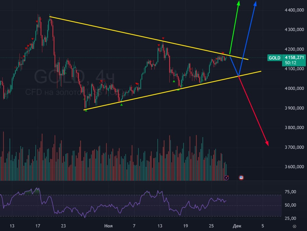 🥇 Золото: 🟢Тут такая же логика как и в серебре, но треугольник не такой бодрый. 🚗 Тоже режим ожидания. Наиболее вероятный сценарий - синий и зеленый. Красный наименее вероятный, по моему мнению. Ждем американцев и тогда этот треугольник будет легко торговать. #Золото #GOLD #GD1 #bogdanoffinvest