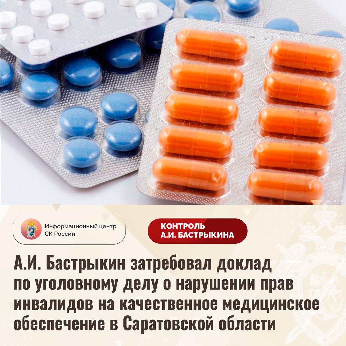 А.И. Бастрыкин затребовал доклад по уголовному делу о нарушении прав инвалидов на качественное медицинское обеспечение в Саратовской области В комментариях в аккаунте приёмной Председателя СК России А.И. Бастрыкина «ВКонтакте» опубликованы обращения жителей Саратовской области по вопросу нарушения прав инвалидов, страдающих сахарным диабетом, на качественное медицинское обеспечение. Гражданам, в числе которых несовершеннолетние, не предоставляются системы непрерывного мониторинга уровня глюкозы в крови и жизненно необходимые лекарственные препараты. Кроме того, инфузионные наборы к инсулиновым помпам выдаются с регулярными задержками. Многочисленные обращения в различные инстанции результатов не принесли. В СУ СК России по Саратовской области расследуется уголовное дело. Председатель Следственного комитета Российской Федерации Александр Иванович Бастрыкин затребовал у руководителя СУ СК России по Саратовской области Дмитрия Александровича Костина доклад о ходе и результатах расследова