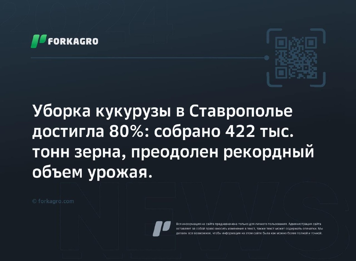 Уборка кукурузы в Ставрополье достигла 80%: собрано 422 тыс. тонн зерна, преодолен рекордный объем урожая. Объем убранного урожая кукурузы на Ставрополье достиг 420 тысяч тонн. Процесс сбора продолжается, убрано около 80% площадей. Глава минсельхоза Сергей Измалков сообщил, что намолотили 10,3 млн тонн зерна, 369 тыс. тонн подсолнечника и 422 тыс. тонн кукурузы. Работы по посеву озимых культур завершены. Перейти к источнику