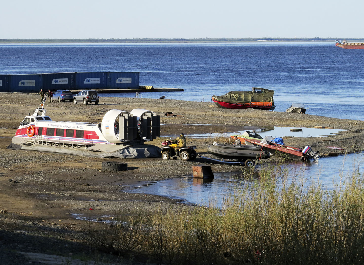 Енисей не обошла стороной маленькая транспортная революция 2010-х годов, когда в Нижнем Новгороде освоили крупносерийное производство судов на воздушной подушке. Ведь они могут ходить по любой ровной поверхности, а значит - сообщение больше не замирает на недели в ледоходы и ледоставы. Вот этот красавец в Дудинке, видимо, дублирует паром: А аэроходы поменьше, вроде популярных на Байкале "Хиусов" и "Марсов" - частные, и здесь таких полно: В Ярцево на заднем плане виден типовой дебаркадер, а 8-местный "Сириус" (способный разгоняться до 90км/ч) ходит круглый год в посёлок Майский выше по речке Сым - как ни странно, это единственный приток Енисея с регулярным пассажирским судоходством (да, ещё есть Ангара - но там всё далеко и в другую сторону). Чаще, впрочем, работает более крупная (на 25 мест) и мощная (до 120км/ч) "Арктика-10" - на берегу мы её не застали. Удивительно, но Енисей - кажется, единственная из главных России, где почти не водятся суда на подводных крыльях. Одинокий "Восхо