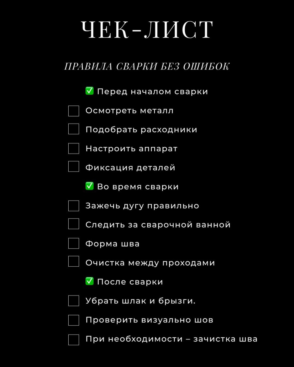 Чек-лист: Главные правила сварки без ошибок ✅ Перед началом сварки 1. Осмотреть металл - убрать ржавчину, краску, масло, грязь. - проверить разделку кромок и зазор. 2. Подобрать расходники - правильный электрод или проволоку (по металлу и толщине). - проверить сухость электродов / чистоту проволоки. 3. Настроить аппарат - выставить ток и напряжение по толщине металла. - проверить полярность (DC+/DC-/AC). 4. Фиксация деталей - прихватки, зажимы или струбцины, чтобы не повело. ✅ Во время сварки 1. Зажечь дугу правильно - короткая и стабильная дуга. 2. Следить за сварочной ванной - равномерное заполнение, нет провалов и прожогов. - скорость движения – без рывков. 3. Форма шва - одинаковая ширина и высота валика. - шов без подрезов и наплывов. 4. Очистка между проходами (если многослойная сварка). ✅ После сварки 1. Убрать шлак и брызги. 2. Проверить визуально шов (ровность, отсутствие пор, трещин). 3. При необходимости – зачистка шва болгаркой. #Сварка #СварочныеМатериалы #Сов