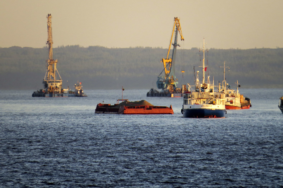От Красноярска до Енисейска на воде активное движение, но с каждым днём пути вниз его всё меньше и меньше. За Турахнском накрывает ощущение пустынности, усиленное огромным простором реки и далёкими низкими берегами. Но вот за очередным поворотом взгляду открываются десятки судов, в том числе огромные плавкраны: У многих - очень уж высокие борта. Совсем не очевидно, что самое активное судоходство на Енисее - от Дудинки не вверх, а вниз, но только это морское судоходство. Енисей - из той "высшей лиги" рек Земли, по которым морские суда способны подниматься на сотни километров. В советское время морским портом считалась Игарка за 500 километров от начала Енисейского залива: поближе к морю, чем Манаус (1700 километров) на Амазонке, но подальше, чем Нанкин (300 километров) на Янцзы. Теперь главная здесь Дудинка с годовым грузооборотом в 4 миллиона тонн: По-настоящему интересны в этом порту суда "Arctic Express" - собственного пароходства "Норильского Никеля". Точнее, его контейнеровозы A