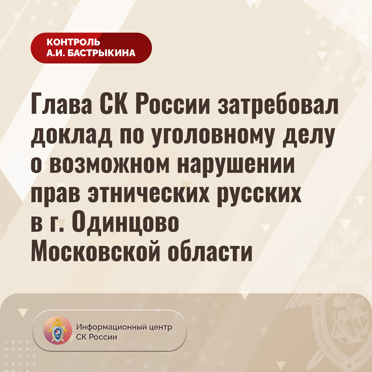 Глава СК России затребовал доклад по уголовному делу о возможном нарушении прав этнических русских в г. Одинцово Московской области